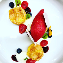 Toucinho do céu, creamy homey, preserved blood orange, smoked goat cheese, goat cheese ice cream.