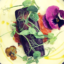 Potato foam, marinated tofu, truffle, peas, tomato and onion.